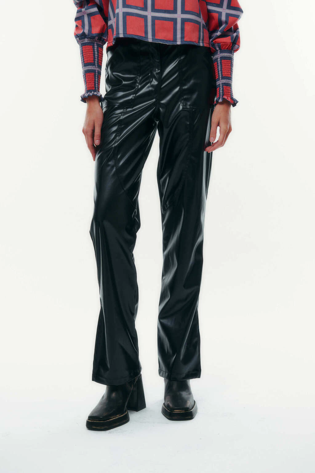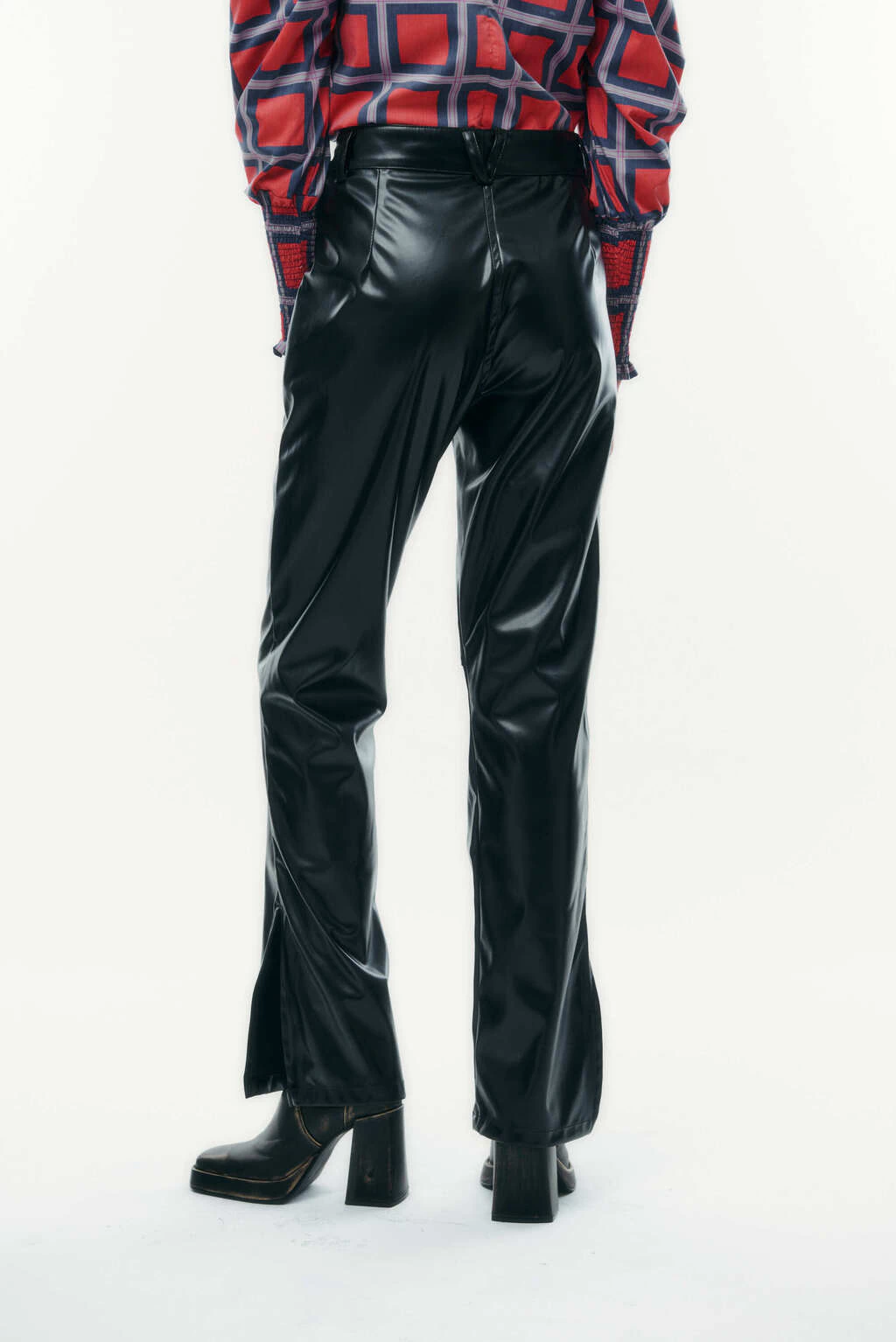 El Pantalón Lu esta confeccionado en ecocuero. Posee bolsillos en el delantero y tajitos en la botamanga. Tiene recortes en las piernas generando un recorrido visual. El calce es ideal.